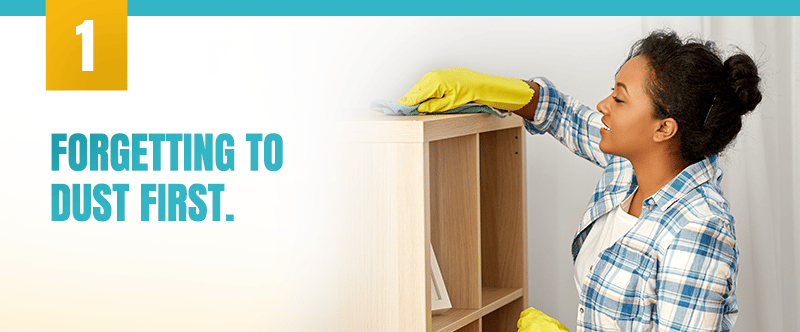 One thing to remember when cleaning your home is to always dust first and work from the top of the shelves, then down and around. This way, dust that doesn't get trapped in your cloth or duster will land on the floor to be swept or vacuumed away.